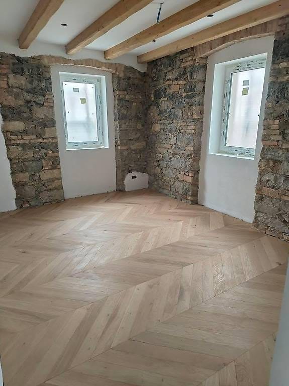 La zona giorno si apre su una cucina con isola, travi a vista e ampie superfici, in un equilibrio riuscito tra rustico e contemporaneo. La camera matrimoniale e il bagno completano una soluzione dal carattere autentico, comoda e ben collegata.